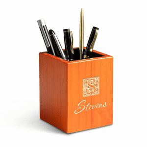 Last Name Monogram Theme Personalized Saddle Finish Wood Pen and Pencil Cup